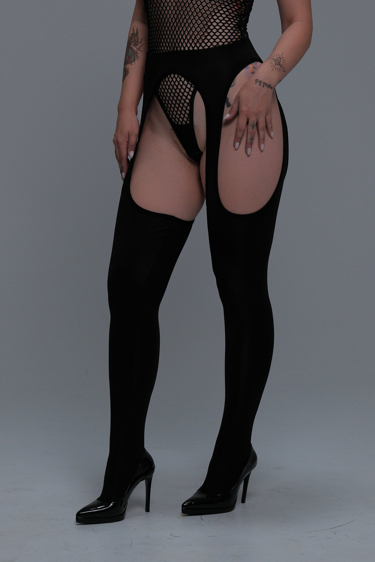 Seductive one-piece lingerie with bold cut-out stockings design. This daring silhouette blends fishnet allure with integrated garter-style legs for a strikingly provocative look.