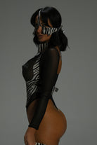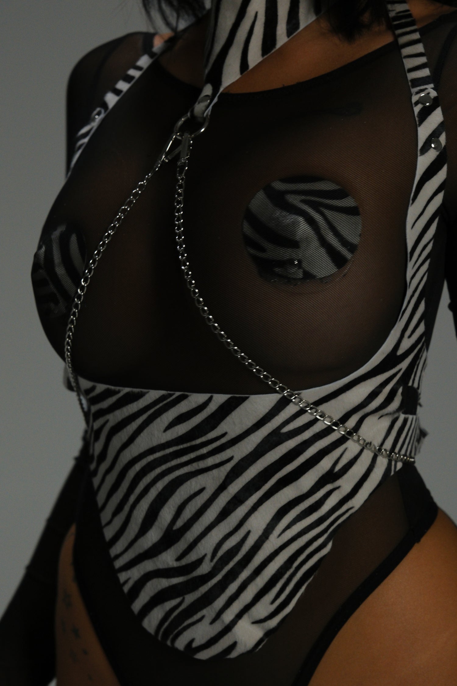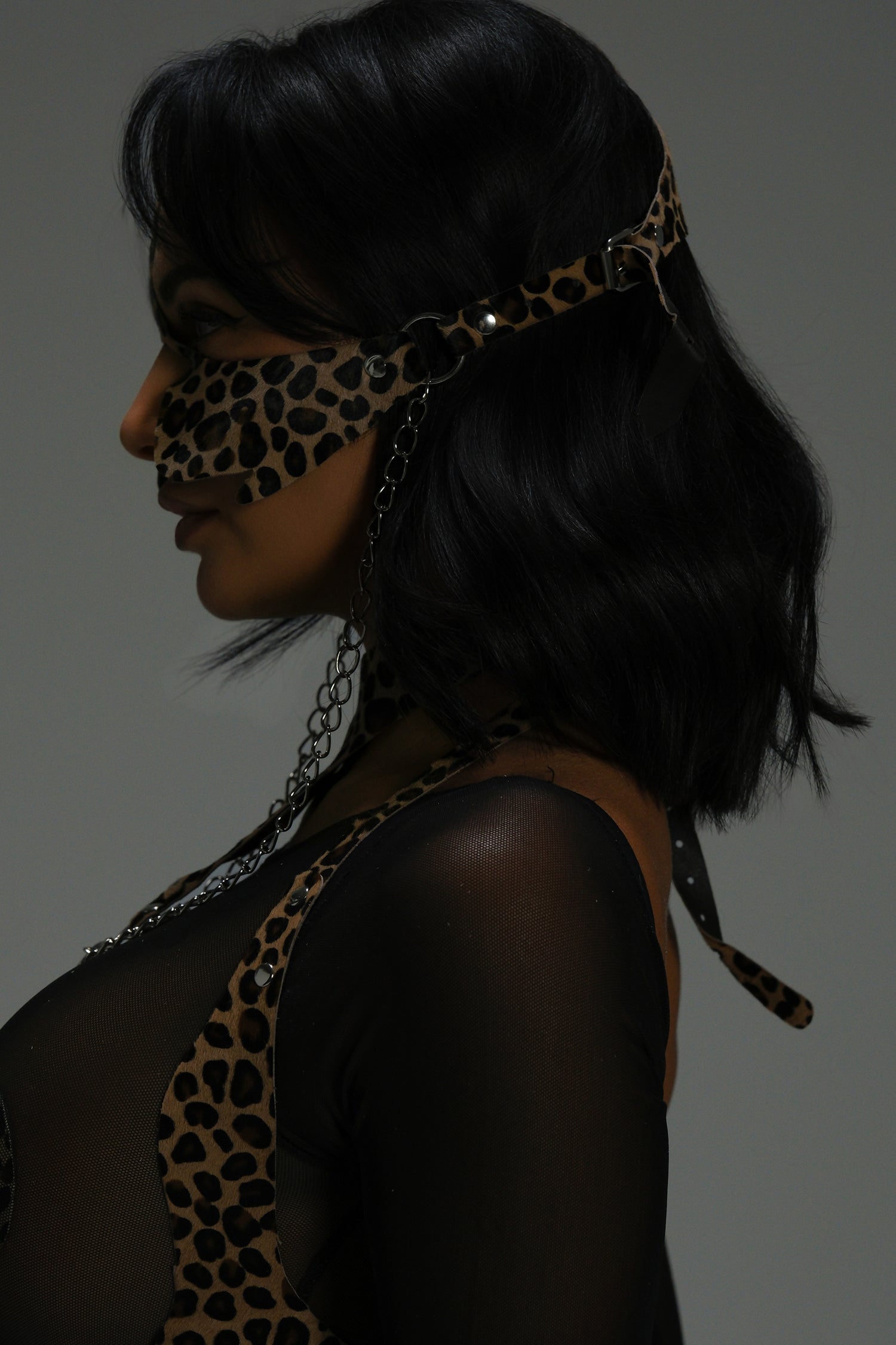 A bold 5-piece bondage ensemble featuring a sheer mesh bodysuit, leather harness bra panel, matching thong, wrist cuffs, and a coordinating blindfold. Handcrafted from vegetable-tanned leather in striking animal prints for a dramatic, high-fashion bondage aesthetic.