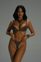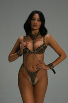 A handcrafted 4-piece leather bondage lingerie ensemble featuring a sculpted bra, matching thong, adjustable collar, and wrist cuffs. Designed from vegetable-tanned cowhide and finished in bold animal prints, this luxury set delivers a powerful fusion of elegance, dominance, and artisan craftsmanship.