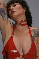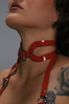A handcrafted glossy leather bondage bodysuit featuring a bold halter-neck choker, cross-front cut-out body design, and fully adjustable straps for a sculpted, dominant silhouette. Made from premium vegetable-tanned cowhide with a high-shine glossy finish.