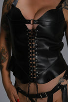 A handcrafted matte black leather bondage corset featuring a sculpted bust shape, adjustable lace-up front, reinforced back straps, and detachable garter harness straps. Made from vegetable-tanned cowhide with a smooth matte finish for a structured and dominant silhouette.
