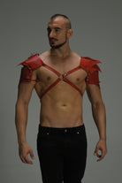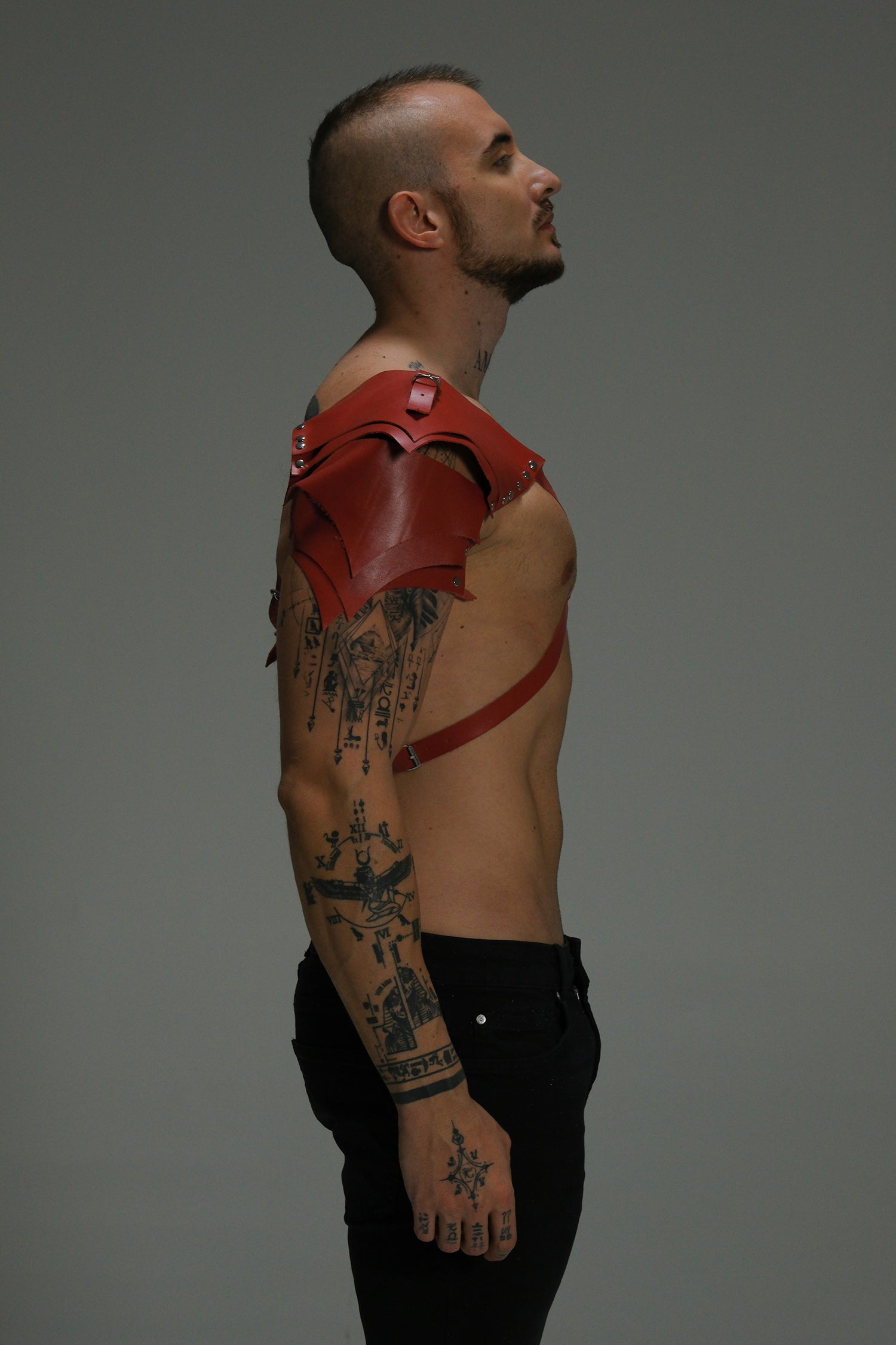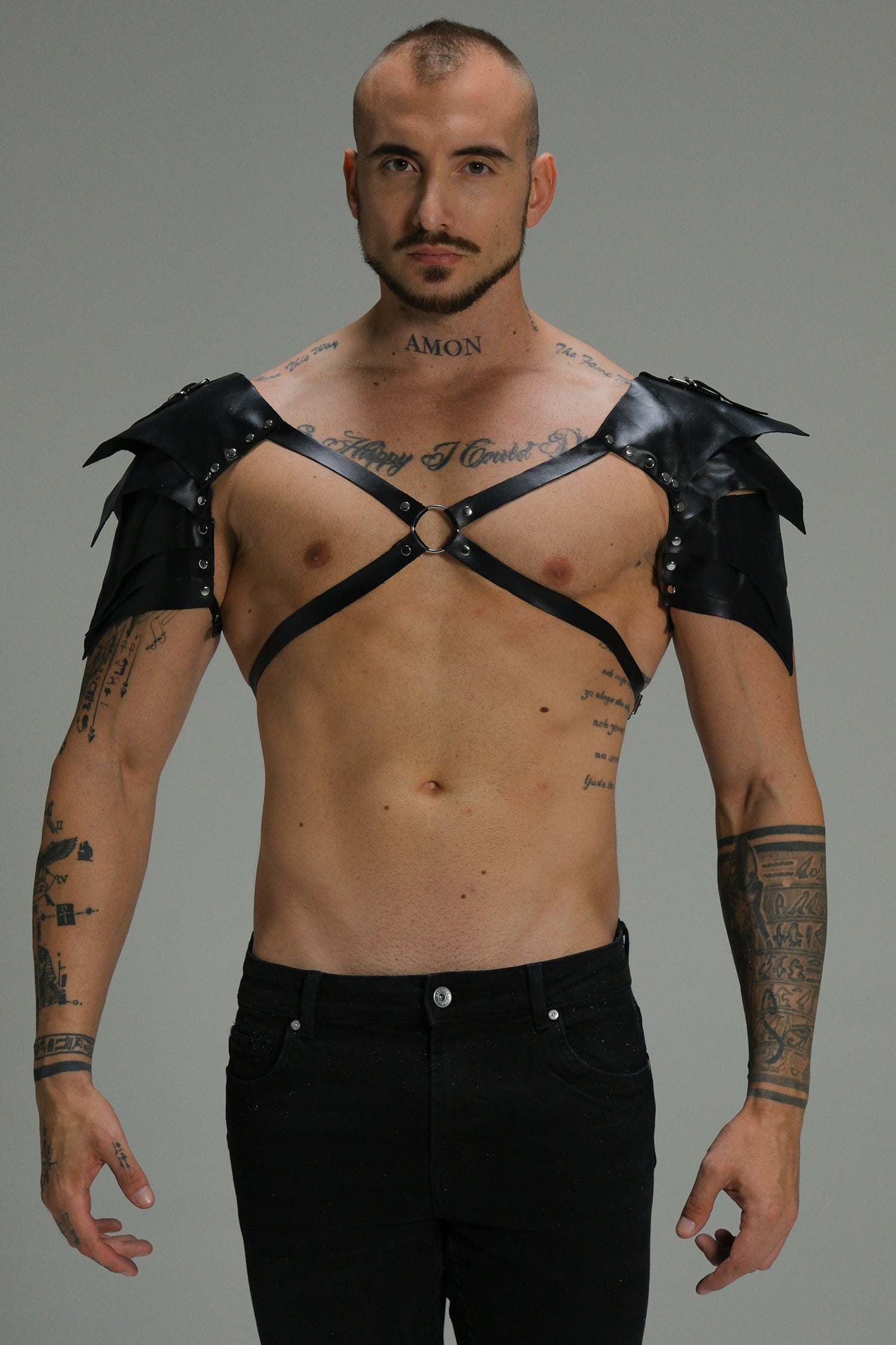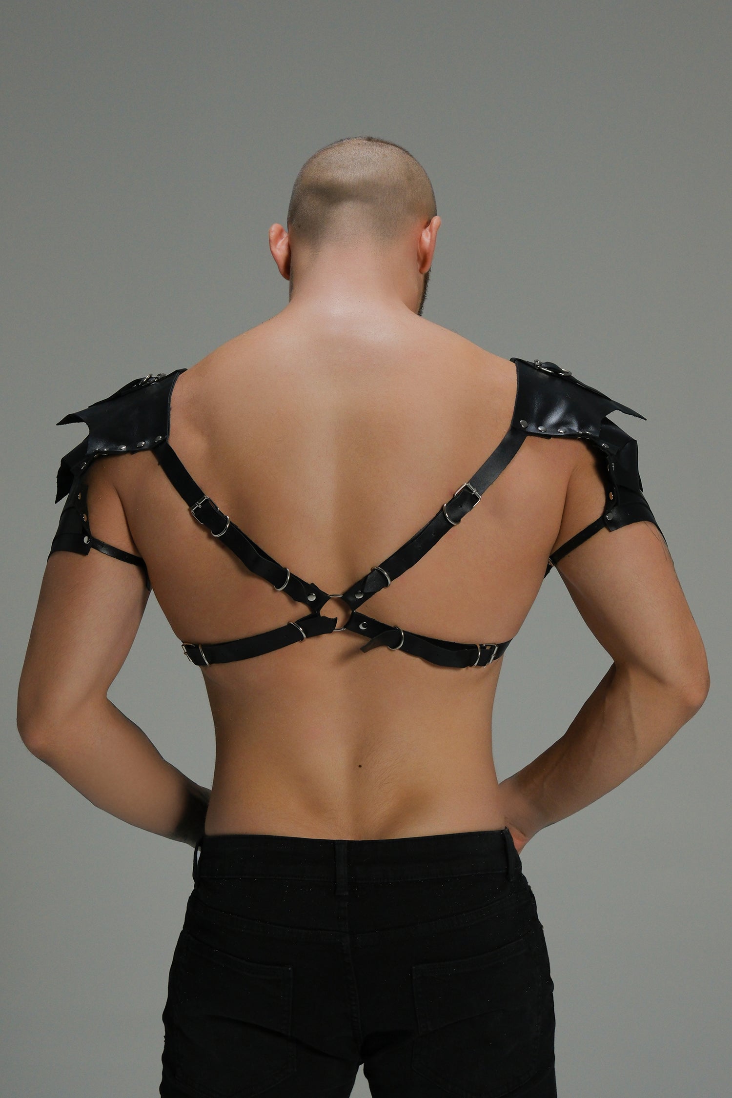 Ein handgefertigtes Schultergeschirr aus Leder mit skulpturalen Schulterflügeln und überkreuzten Gurten, entworfen für extravagantes Styling, Fetischmode und Performance-Ästhetik. Gefertigt aus hochwertigem, pflanzlich gegerbtem Leder mit einer glatten, matten Oberfläche.