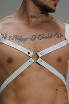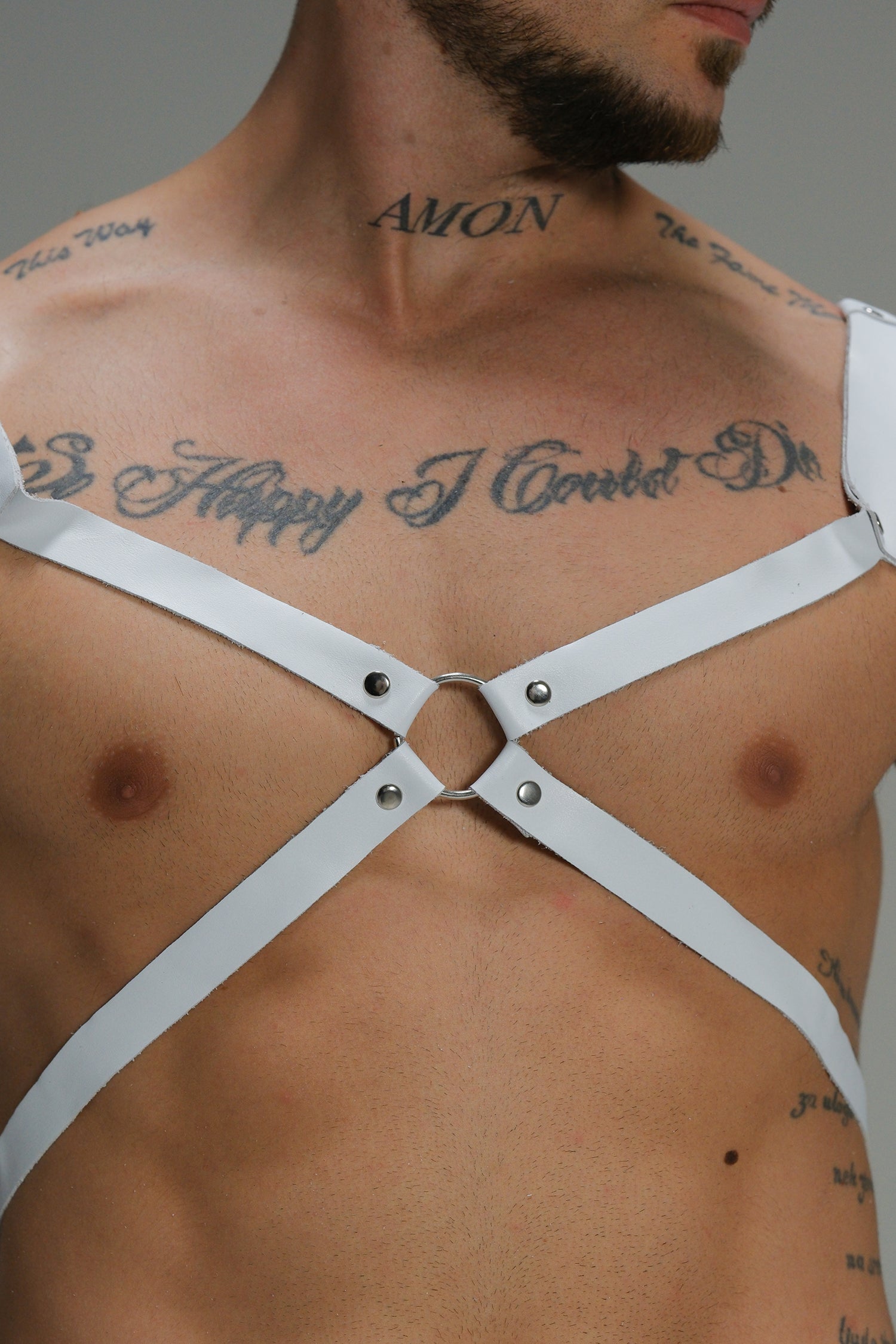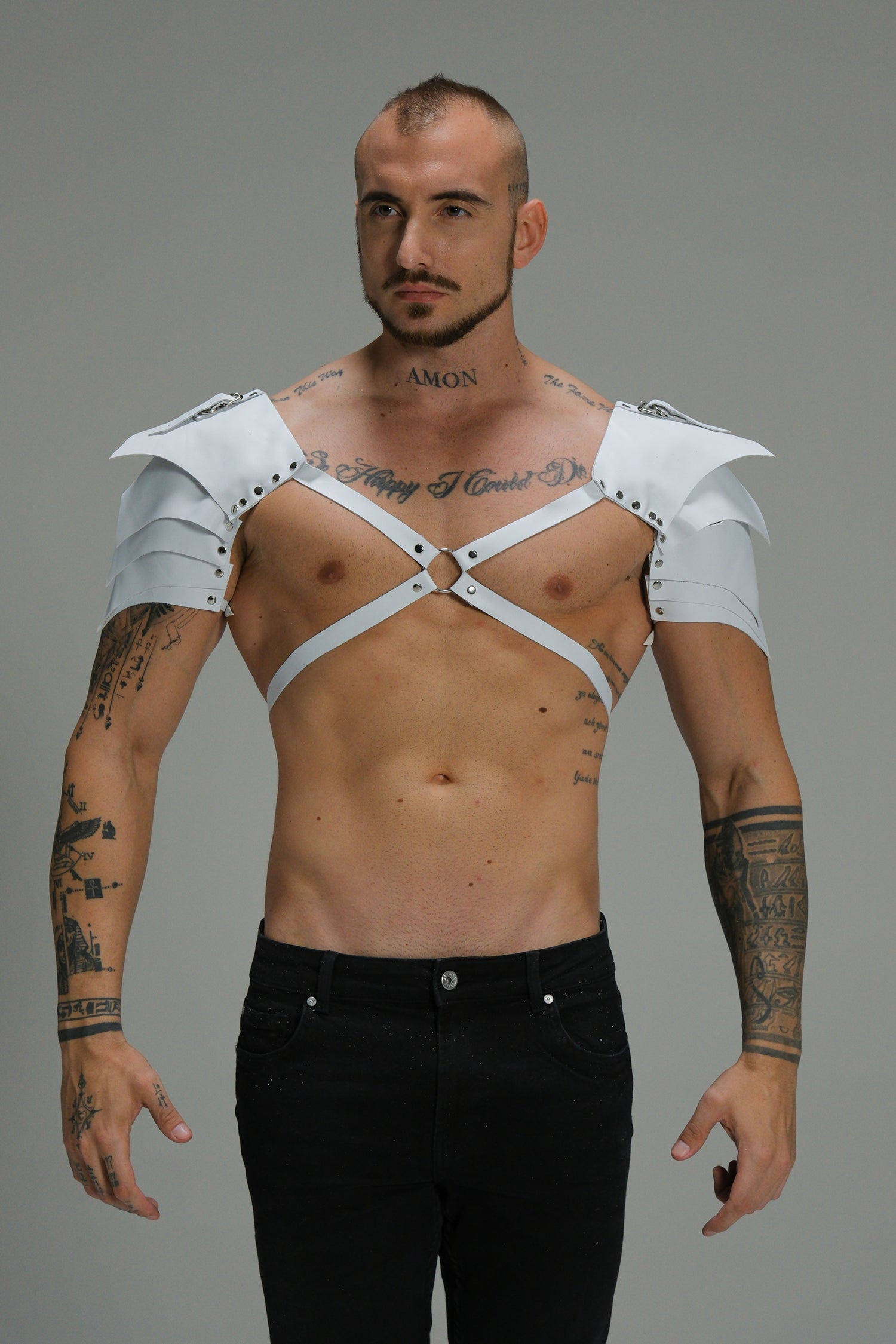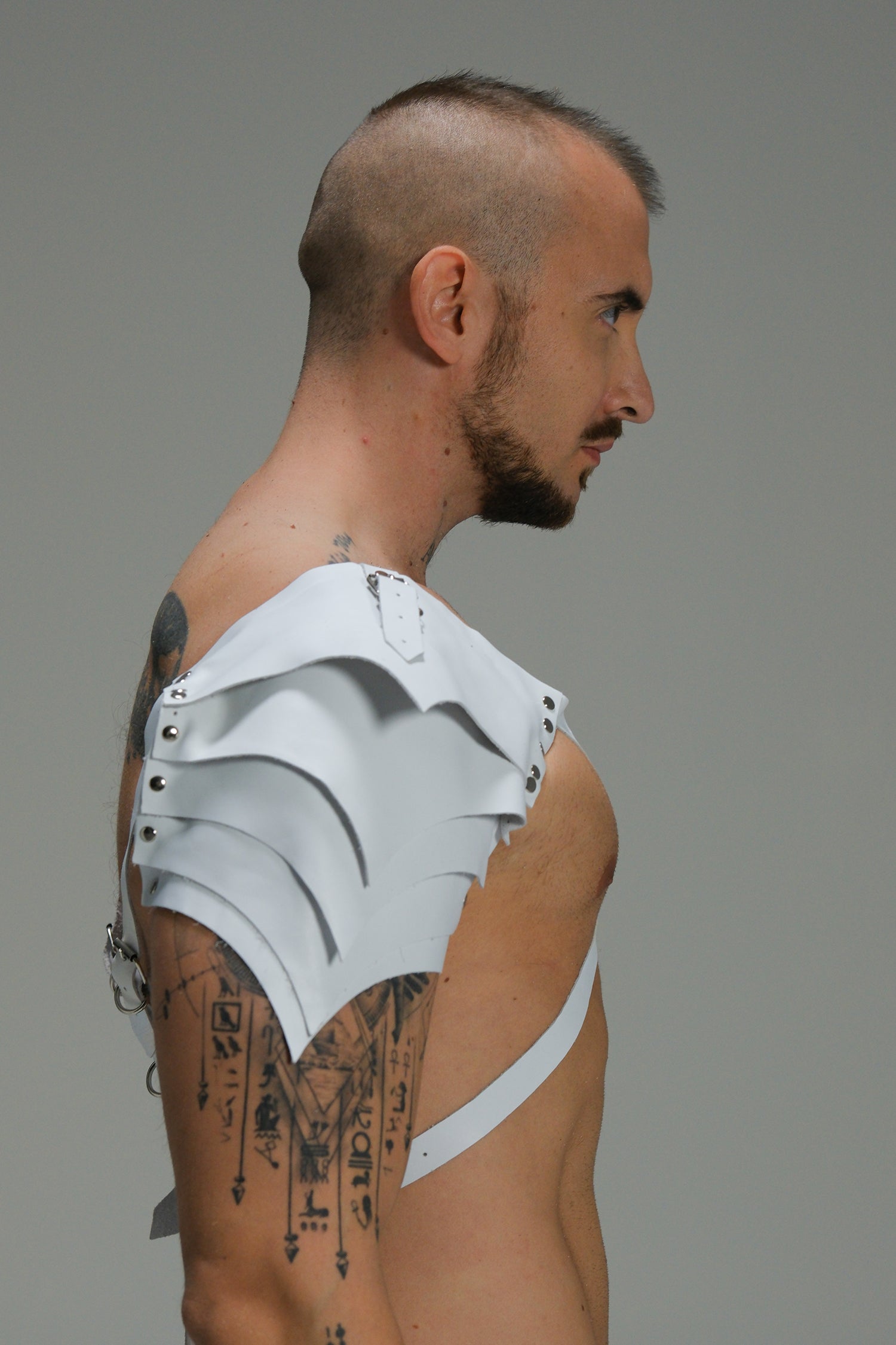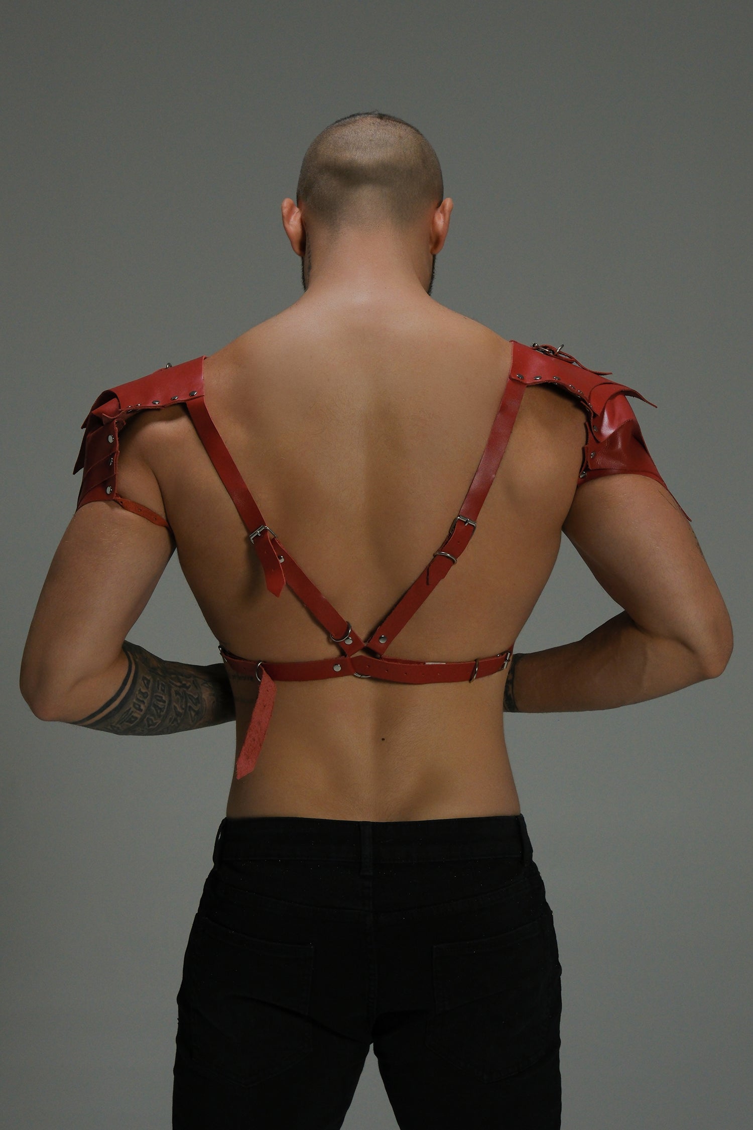 Ein handgefertigtes Schultergeschirr aus Leder mit skulpturalen Schulterflügeln und überkreuzten Gurten, entworfen für extravagantes Styling, Fetischmode und Performance-Ästhetik. Gefertigt aus hochwertigem, pflanzlich gegerbtem Leder mit einer glatten, matten Oberfläche.