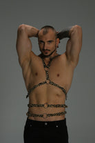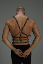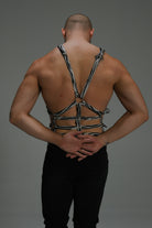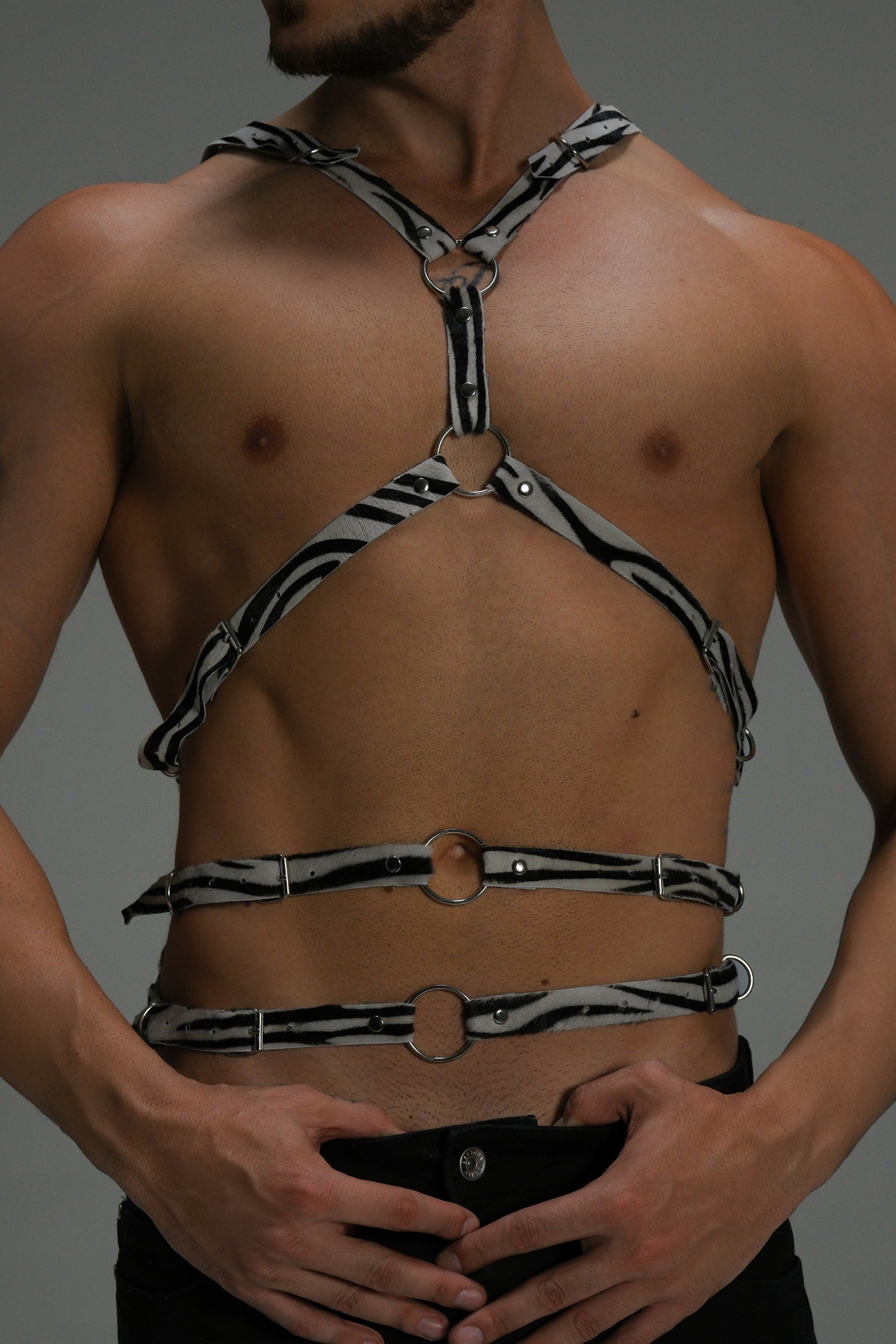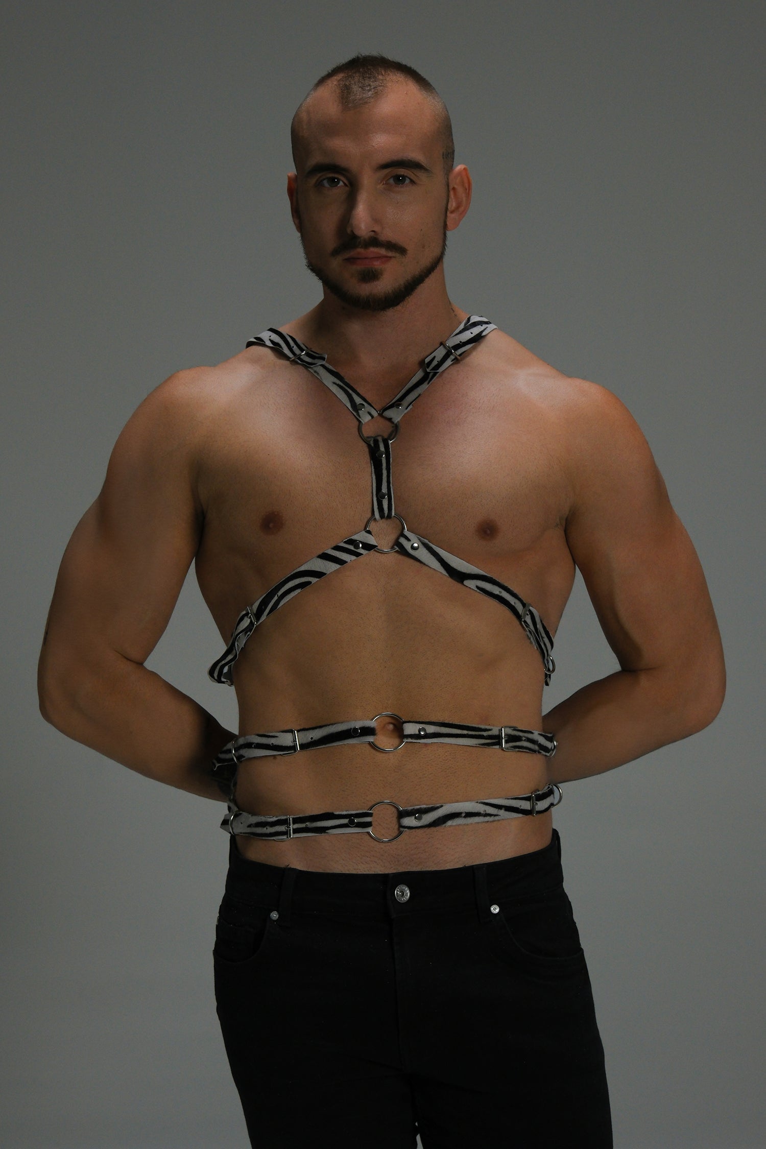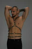 Ein handgefertigtes Bondage-Harness aus Leder für Herren mit mehreren Riemen, Tiermuster und verstellbaren Gurten zur Körperfixierung. Hergestellt aus hochwertigem, pflanzlich gegerbtem Rindsleder für Langlebigkeit, Flexibilität und eine markante, ausdrucksstarke Silhouette.