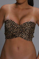 Ein handgefertigtes Bandeau-Top aus Leder mit überkreuztem Vorderteil, doppelten Trägern am Rücken und Metallring-Details. Erhältlich in den auffälligen Mustern Zebra und Leopard, vereint dieses trägerlose Top luxuriöse Handwerkskunst mit einer gewagten, von der Fetischkultur inspirierten Ästhetik.