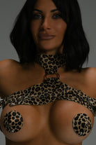 A handcrafted 3-piece leather bondage harness featuring a wrap-around chest design, matching upper-arm straps, and coordinating nipple covers. Made from vegetable-tanned cowhide in a bold leopard print for a striking and sculptural look.